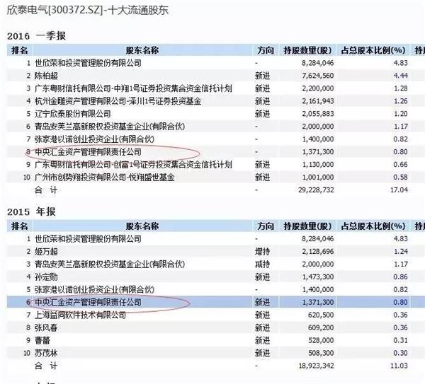 2016年一季度的前十大流通股東,國家隊中央?yún)R金赫然在列,持有137.13萬股,占流通股比例1.52%。具體來看,匯金是于去年三季度大幅買入欣泰電氣,進(jìn)入到該公司前十大流通股東中,而截至今年一季報,數(shù)據(jù)顯示中央?yún)R金股災(zāi)期間增持的股份并未減持。