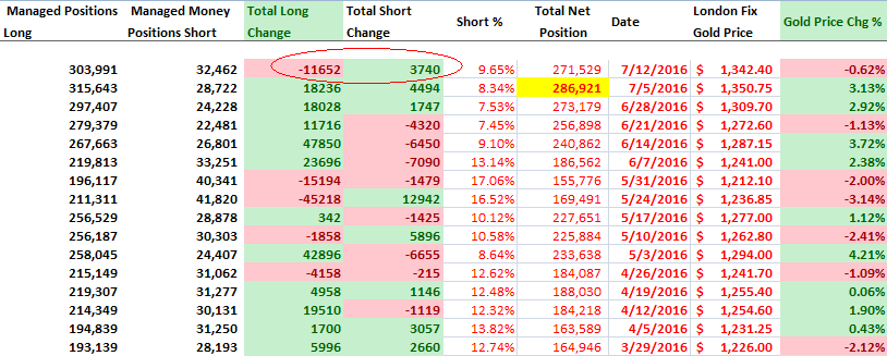 而在截至7月12日的一周里,黃金期貨和期權(quán)凈多頭頭寸減少了5.4%,至271529份合約。此前一周曾達(dá)到286921份合約,創(chuàng)下2006年有數(shù)據(jù)以來的最高水平。