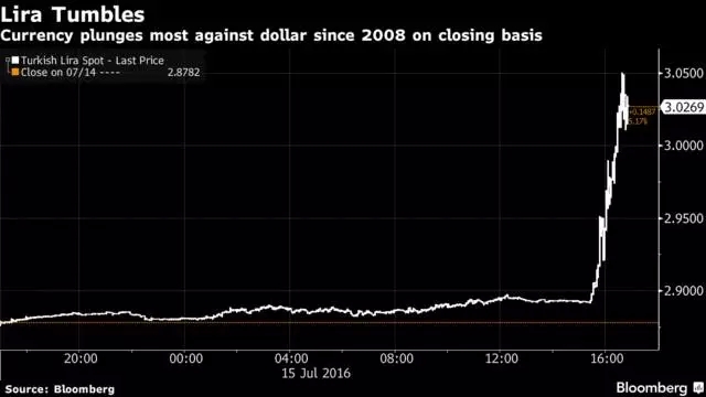 土耳其軍方宣布政變推翻現(xiàn)政府后,土耳其里拉下跌4.6%,跌至1美元兌3.0157里拉,創(chuàng)下自2008年來最大單日跌幅。