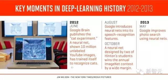 深度學(xué)習(xí)歷史關(guān)鍵點(diǎn):2012年谷歌大腦識(shí)別貓臉(6月),8月谷歌將神經(jīng)網(wǎng)絡(luò)引入語(yǔ)音識(shí)別,10月Hinton的學(xué)生在ImageNet競(jìng)賽奪冠,成績(jī)大幅提升;2013年5月谷歌用神經(jīng)網(wǎng)絡(luò)改善照片搜索功能。