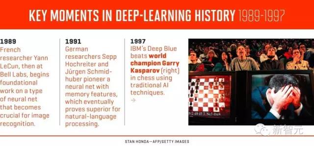 深度學(xué)習(xí)歷史關(guān)鍵點(diǎn):1989年LeCun用卷積神經(jīng)網(wǎng)絡(luò)識(shí)別手寫體,1991年遞歸神經(jīng)網(wǎng)絡(luò)發(fā)明,1987年IBM深藍(lán)戰(zhàn)勝卡斯帕羅夫。