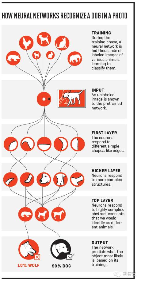 下一層,可能會(huì)發(fā)現(xiàn)更多復(fù)雜的配置,比如,一個(gè)圓圈中排列的許多個(gè)角”,這一層中的神經(jīng)元可能會(huì)對(duì)鳥的頭部作出反應(yīng)。在一個(gè)更深的層,一個(gè)神經(jīng)元可能會(huì)探測(cè)到頭部圓圈中反復(fù)出現(xiàn)的嘴部輪廓?!斑@構(gòu)成了一個(gè)很好的線索,可以判斷出這可能是鳥的頭部”,Hinton說(shuō)。每一個(gè)更深層次的神經(jīng)元都會(huì)對(duì)更加復(fù)雜和抽象的概念作出反應(yīng),直至最后有一層對(duì)我們概念中的“鳥”作出匹配反應(yīng)。
