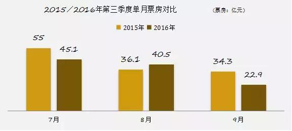 還記得我在寫Q2季度觀察時(shí)的標(biāo)題是“接不住這三招,接下來的市場只會(huì)跌的更慘”。額……這個(gè)真的就尷尬了,Q3的票房增長率從Q2的-4.5%變成-13.5%,果然跌的更慘。如下圖所示:Q3的同比下跌,主要源于7月和9月的單月票房沒能守住陣地,均比去年同期少了10億元左右。