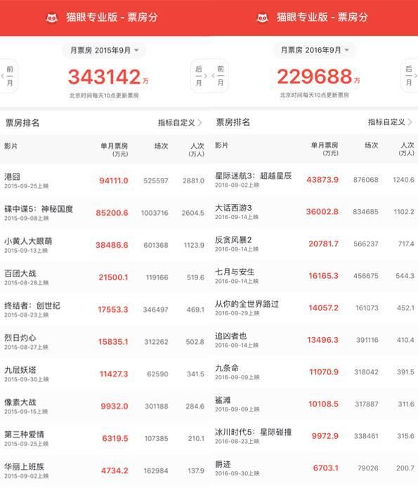 一、受市場寒意的影響,國慶檔影片沒有一部敢和去年的《港囧》一樣提檔一周上映,導(dǎo)致9月下旬有四天單日票房在3000萬線徘徊是同比去年下跌的主要原因;