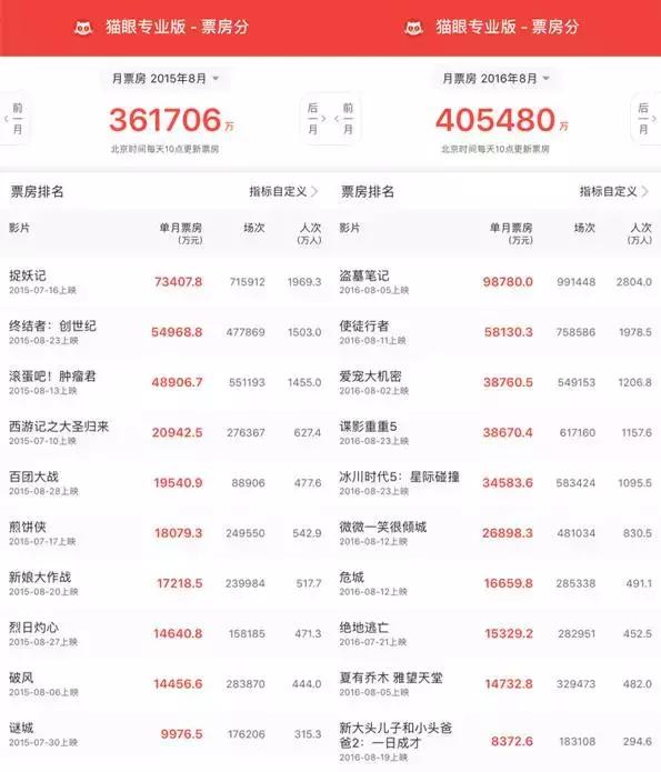 而同比今年8月票房略有提升,通過下圖可以看出,也是源于今年八月初《盜墓筆記》和月中《使徒行者》的意外爆發(fā),充分激發(fā)了主流觀影群體的消費(fèi),《愛寵大機(jī)密》和《冰川時(shí)代5》又及時(shí)的把家庭觀眾拉回了影院,而去年8月僅有《滾蛋吧!腫瘤君》和《終結(jié)者》兩部主力電影撐場。
