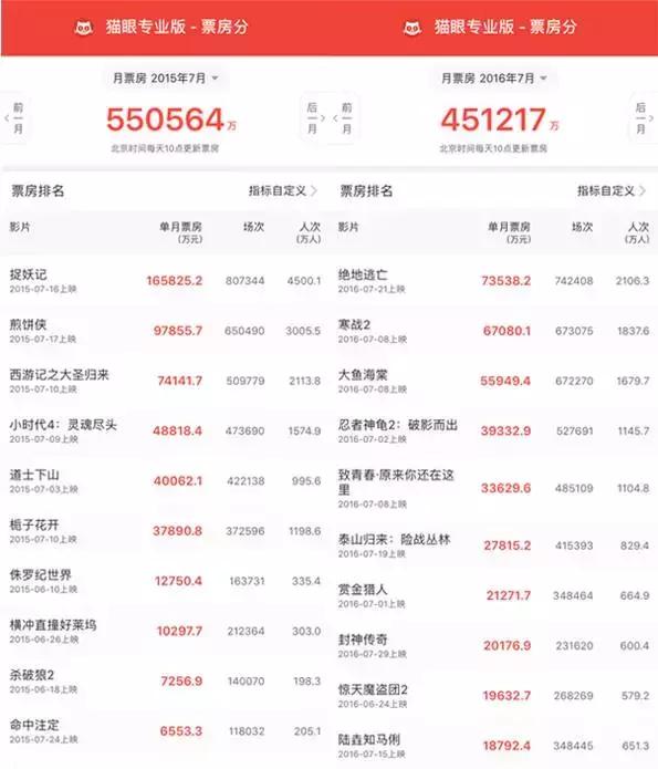 通過近兩年7月同期電影TOP10對比發(fā)現(xiàn),2016年該月票房下跌源于三個(gè)方面: