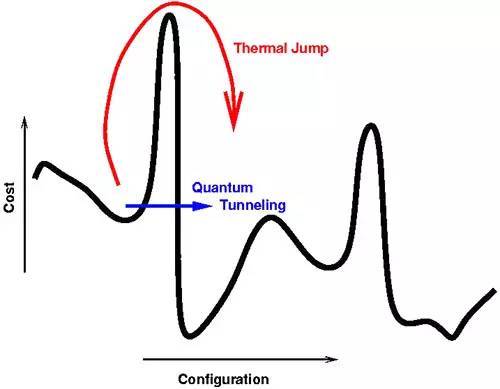 和基于熱波動(dòng)原理的模擬退火(simulated annealing)不同的是,量子退火(Quantum annealing)利用了量子波動(dòng)。量子波動(dòng)使得量子具有穿透比它自身能量高的勢(shì)壘的能力,即量子隧穿效應(yīng)。量子退火通過(guò)模擬這一過(guò)程來(lái)實(shí)現(xiàn)對(duì)目標(biāo)系統(tǒng)的優(yōu)化。