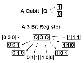 3個(gè)比特可以代表8種狀態(tài),但是寄存器卻只能記錄其中的一個(gè)結(jié)果,而3個(gè)量子比特構(gòu)成的寄存器同時(shí)也具備了其線性疊加態(tài)效果,于是可以同時(shí)記錄8種數(shù)值結(jié)果。通過(guò)這樣一個(gè)簡(jiǎn)單的例子就能看出來(lái)量子計(jì)算機(jī)驚人的計(jì)算能力,是同數(shù)目(設(shè)為n)比特構(gòu)成的經(jīng)典計(jì)算機(jī)的2n倍。