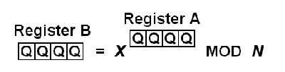 通過(guò)寄存器B中一系列復(fù)雜的運(yùn)算執(zhí)行,上述的f可以在量子計(jì)算機(jī)中獲得,得出的f值會(huì)帶入下列公式計(jì)算出一個(gè)可能的因數(shù)。得出的結(jié)果不會(huì)一定就是正確的,但是生成f值的量子干涉會(huì)反復(fù)嘗試對(duì)x進(jìn)行代換從而篩選出正確的結(jié)果并排除錯(cuò)誤的答案。