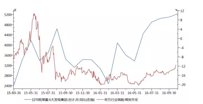 我們可以用煤炭股在資本市場(chǎng)表現(xiàn)的去理解這一線索。盡管按照一般的理解,煤炭股價(jià)是供給側(cè)改革在驅(qū)動(dòng);但從經(jīng)驗(yàn)數(shù)據(jù)來(lái)看,煤炭股股價(jià)的所有拐點(diǎn)都與發(fā)電耗煤增速高度相關(guān)。這意味著市場(chǎng)是有效的,基本面決定拐點(diǎn),供給側(cè)改革只是決定彈性。一直在加速的耗煤增速是映射在資本市場(chǎng)的價(jià)格反應(yīng)的主要理由。