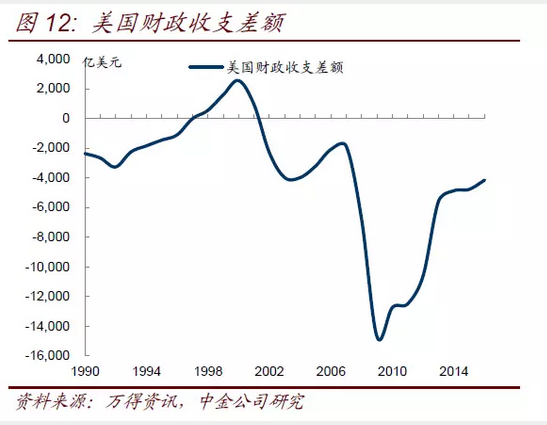 無論是減稅還是增加基建建設,都是激進型的財政政策,會相應增加財政赤字和國債發(fā)行。最近幾年美國的財政赤字規(guī)模和赤字率有所下降(圖12),從次貸危機后的超過1萬億的赤字規(guī)模降至最近兩年的4000-5000億,背后得益于美國經(jīng)濟的逐步復蘇和居民收入的回升推動稅收增長。按照特朗普的減稅方案,暫不考慮支出端的變化,保守估計每年美國的財政收入會減少5000億美元甚至更多。這意味著美國的財政赤字可能要從目前4000-5000億美元水平回升到1萬億以上,對應的赤字率從3%-4%的水平上升到8%-10%,甚至可能更高。