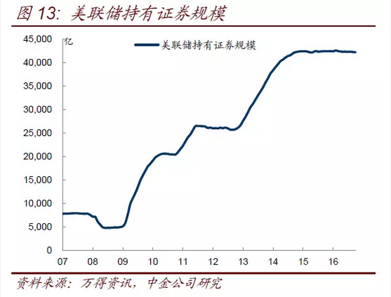 美國次貸危機后,財政赤字也一度明顯增加,但當時美聯(lián)儲通過QE釋放大量流動性(圖13),2009年到2015年期間美聯(lián)儲持續(xù)買入債券(包括國債、機構債和MBS),緩沖了國債供給增加對市場的影響。但目前美聯(lián)儲已經(jīng)停止QE(只保持存量債券到期再投資),甚至開始逐步加息,市場擔心在沒有貨幣政策配合的情況下,增加財政赤字,一方面經(jīng)濟基本面可能對債市不利,另一方面供需關系可能也對債市不利。正是在這種擔憂下,美國以及發(fā)達經(jīng)濟體的債券收益率在美國總統(tǒng)大選后短短的3天時間內(nèi)大幅上升,美國10年期國債收益率從1.85%上升到2.15%,一周之內(nèi)上升了37bp,上升速度之快多年未見(圖14)。由于收益率上升太快,也觸發(fā)了止損盤的被動拋售,放大了其影響。同樣瘋狂的還有股市、大宗商品和外匯。背后的主因和邏輯仍是特朗普上臺后其政治主張的推演。對財政刺激的樂觀預期推動股市和大宗商品(尤其與基建相關的有色和黑色金屬)價格快速上漲,倫銅在一周內(nèi)漲幅接近20%。墨西哥比索受到特朗普計劃禁止墨西哥移民進入以及對墨西哥征收高進口關稅的影響也出現(xiàn)暴跌。