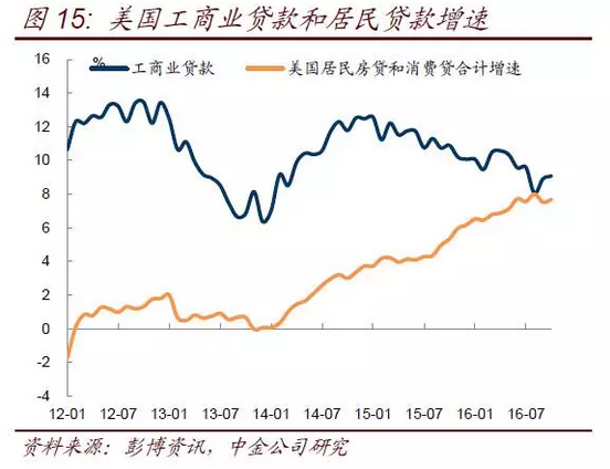 今年來看,美國經(jīng)濟有溫和的復蘇,表現(xiàn)在就業(yè)情況持續(xù)改善,工資增速回升,推動居民杠桿重新恢復,居民消費和買房需求推動經(jīng)濟改善。但制約因素在于美國的企業(yè)部門在經(jīng)濟和政治形勢不明朗的情況下,生產(chǎn)意愿和投資意愿不強,表現(xiàn)在產(chǎn)品庫存沒有回升,投資相關的耐用品訂單也偏弱。從企業(yè)貸款增速和居民貸款增速的一降一升也可以看出這種差異(圖15)。總統(tǒng)大選明朗后,未來的政策基調(diào)也會逐步明朗,而對企業(yè)減稅以及增加基建投資可能會帶動企業(yè)的生產(chǎn)和投資意愿回升。從這個角度而言,明年美國經(jīng)濟仍有望繼續(xù)穩(wěn)步復蘇。因此,邏輯上而言,有利于風險資產(chǎn)而利空于債券是對的,只是市場在政策尚未開始推行,多大程度上能實現(xiàn)這些政策承諾還未明朗的情況下就反應如此劇烈,可能把未來潛在的利好利空都提前釋放了,甚至過度釋放。因此也可能存在反向的糾正。周五晚上國內(nèi)商品期貨的暴漲后暴跌的驚險一幕也是這種過度預期后重新糾正的典型例子。