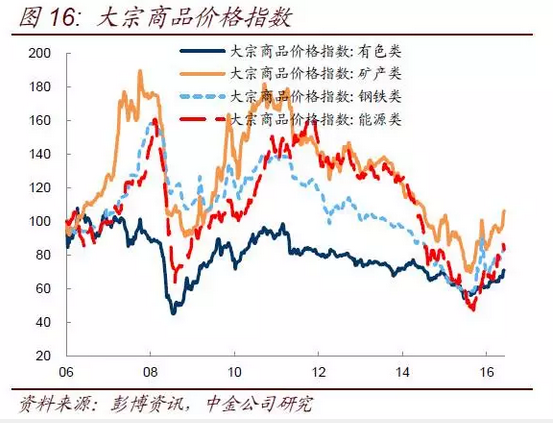隨著大宗商品價格的快速上漲,中國也悄然進入了再通脹預期,對經(jīng)濟增長和通脹的逐步樂觀導致了對債券的謹慎。大宗商品價格在進入10月份之后形成了加速上漲態(tài)勢。尤其是煤炭先開始引領這一輪的超預期行情。我們在10月22日周報《煤炭的故事會在債市上演么?》分析過煤炭持續(xù)快速上漲背后的邏輯,即煤炭在中短期內(nèi)呈現(xiàn)供不應求局面。供給側改革今年在煤炭領域執(zhí)行的最為嚴格和徹底,煤炭的產(chǎn)量同比下跌了10%-20%。但煤炭的需求是基本持平甚至正增長的,比如粗鋼產(chǎn)量基本持平甚至正增長,而發(fā)電量最近幾個月也是正增長。進入冬季,在鋼鐵企業(yè)冬儲以及發(fā)電和工業(yè)企業(yè)也增加對煤炭需求的情況下,煤炭的供給顯得尤為不足。盡管煤炭產(chǎn)量只是下降了10%-20%,但金融市場定價并非線性,而是邊際上會放大這種供應緊缺效應,從而推動煤炭價格大幅上漲。年初至今,煤炭價格的漲幅超過1倍,焦煤的漲幅甚至接近2倍,尤其是9月份以來呈現(xiàn)加速上漲態(tài)勢。煤炭作為中國非常重要的一項能源和化工產(chǎn)品原材料,其價格的上漲開始推動其他工業(yè)品價格跟隨上漲。比如煉鐵煉鋼需要用到煤炭,鋼鐵價格也在10月份之后快速拉漲,螺紋鋼從2200元/噸漲到3000元以上。鋼鐵價格一漲,也帶動鋼鐵的原材料——鐵礦石價格跟漲。煤炭價格上漲,發(fā)電企業(yè)的成本上升,一些自建電廠的電解鋁生產(chǎn)企業(yè),也因為發(fā)電成本的上升而抬升鋁的價格。在比價效應下,其他有色金屬也開始跟漲(圖16)。最終,特朗普當選帶來的刺激預期徹底點燃了大宗商品的做多熱情,在基本面還沒有發(fā)生很大變化的情況下,各種大宗商品輪番上漲,甚至連續(xù)沖擊漲停板。這也抬升了市場對未來的通脹預期。