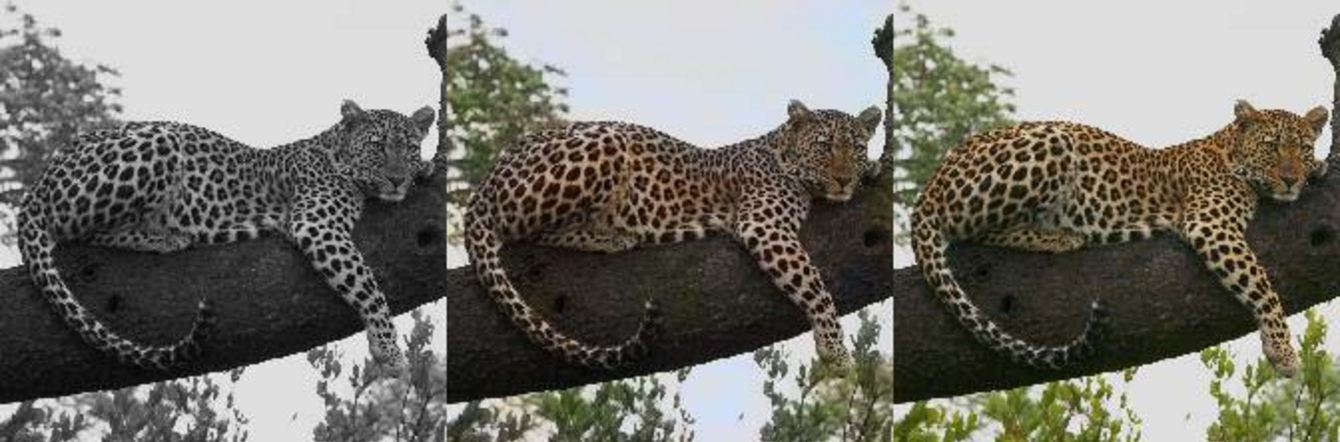 左邊:黑白照片;中間:自動上色的照片;右邊:真實的顏色